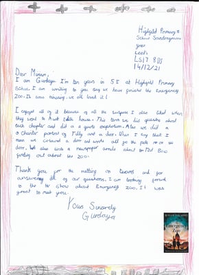 The Emergency Zoo is incredible and I am a bit upset I have finished it. My favourite part of the book was Neville Chamberlain announcing war and they had to think of another way to help the pets. I have learnt lots of new words from your book.